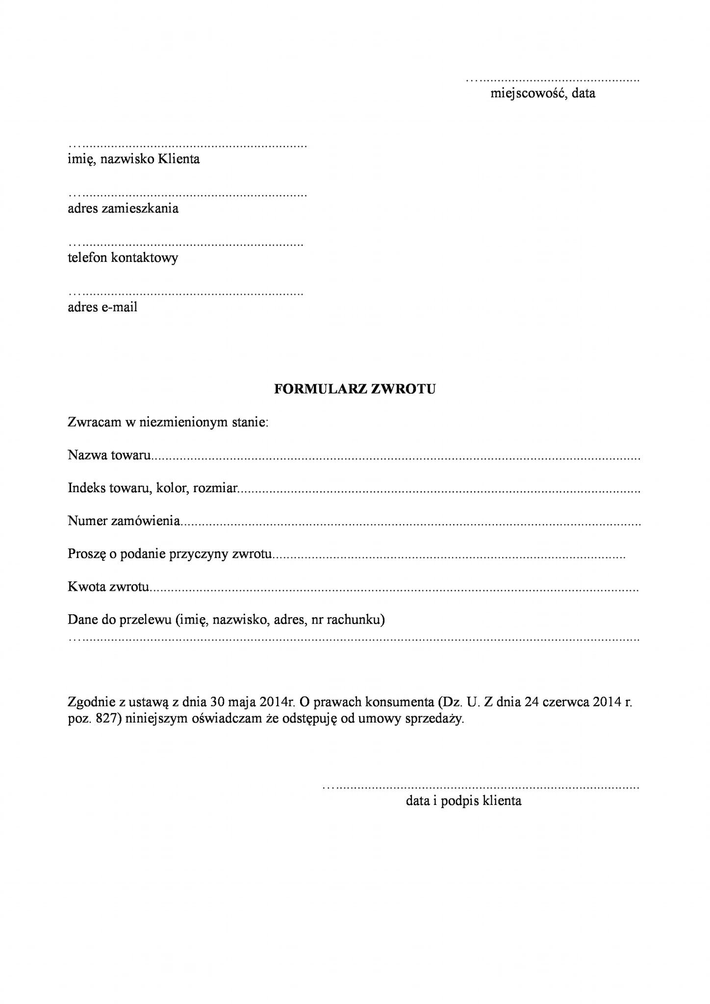 Zgodnie z obowiązującym prawem, masz 14 dni na zwrot towaru. Aby odstąpić od umowy i zwrócić zakupiony u nas produkt, wypełnij potrzebne oświadczenie i wyślij go na nasz adres wraz ze zwracanym produktem/produktami: