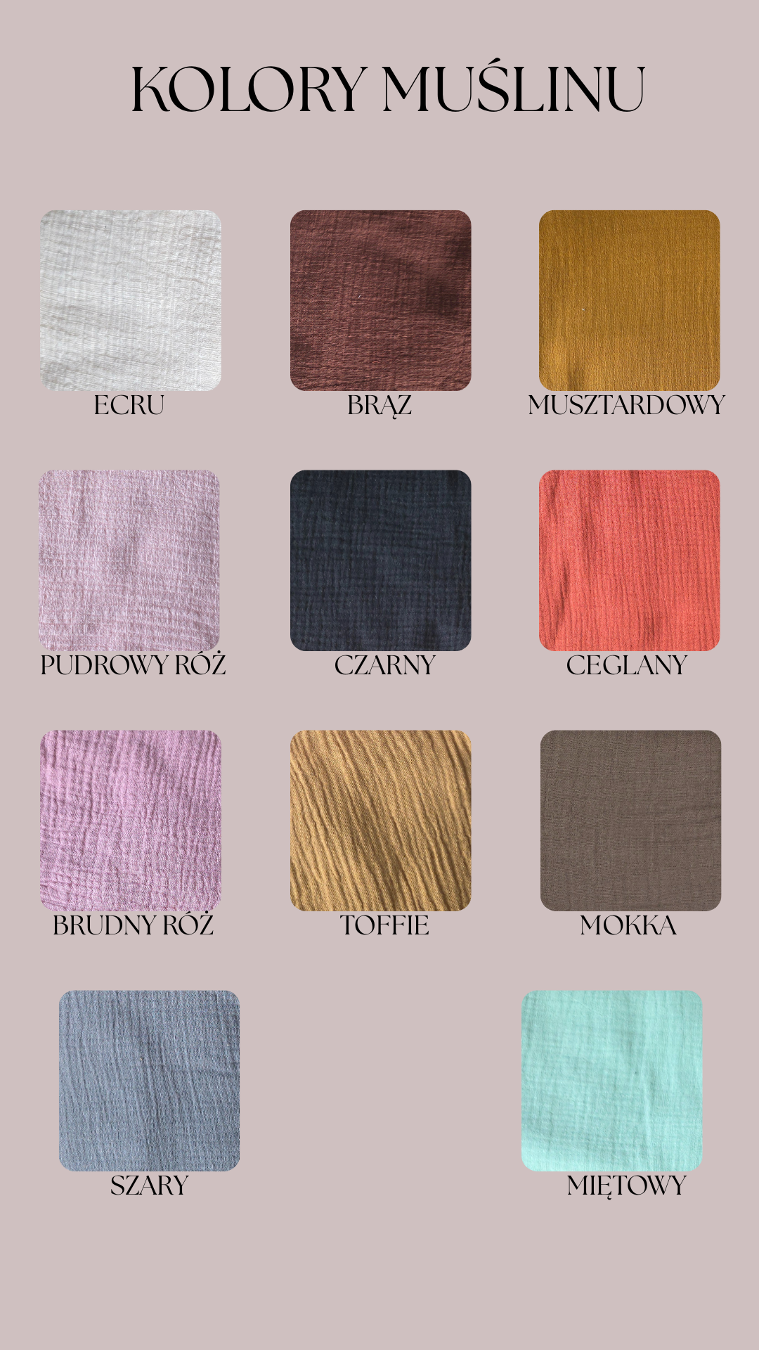 - kolor Ecru,Brązowy,Miętowy,Ceglany,Brudny róż,Szary,Mokka,Musztardowy,Czarny,Pudrowy róż,Toffie